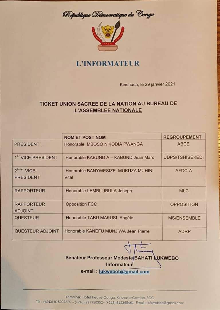Union sacrée : Voici le ticket de Tshisekedi au bureau définitif