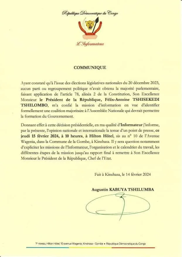 Formation du prochain Gouvernement en RDC : L’informateur Augustin Kabuya annonce son calendrier de travail jeudi 15 févier 2024 à Kinshasa ( Communiqué)