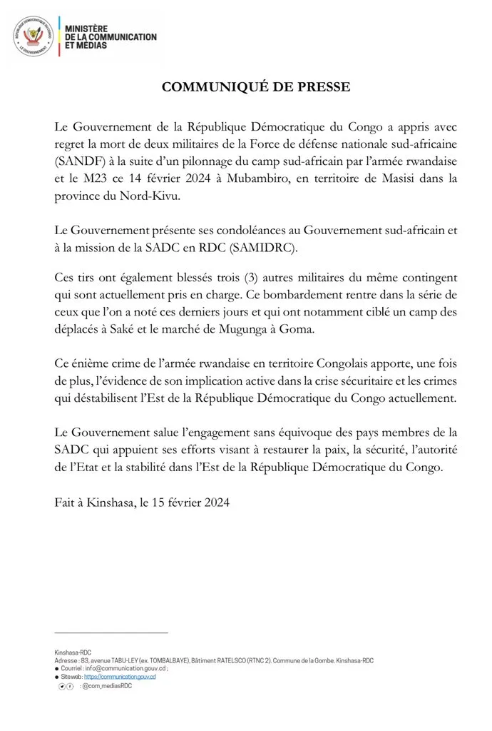 RDC : Deux militaires sud-africains tués dans une attaque attribuée au M23 à Masisi (Communiqué)