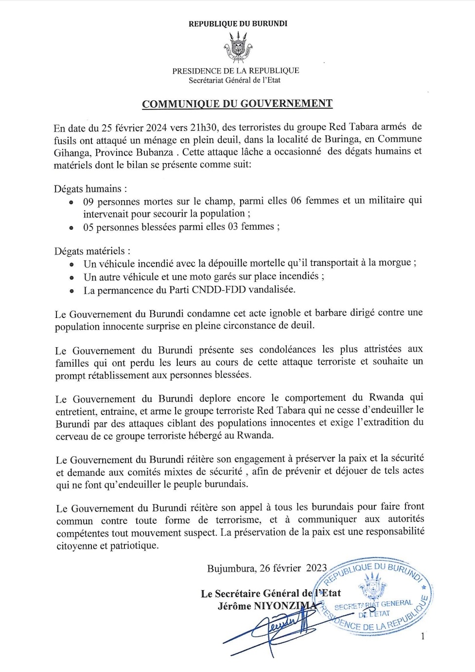 Sécurité : Le Burundi décrie encore le comportement du Rwanda qui entretient le groupe terroriste Red-Tabara pour endeuiller les populations ( Communiqué)