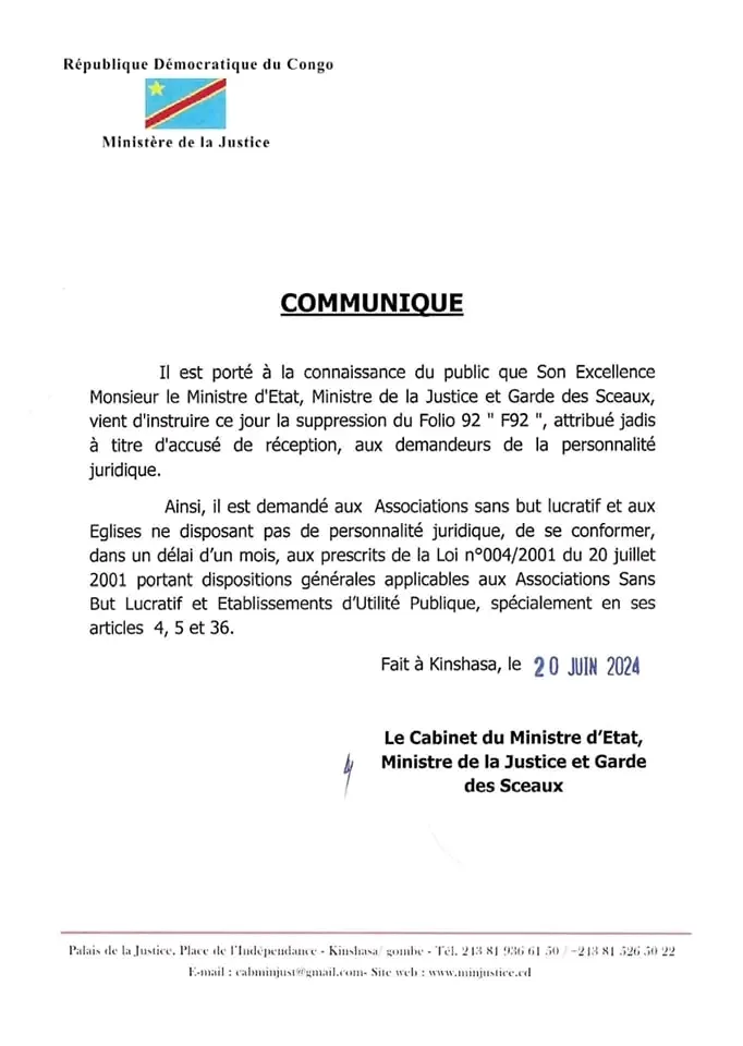 RDC : Le ministre de la justice Constant Mutamba supprime le Folio 92 « F92 » ( Communiqué)