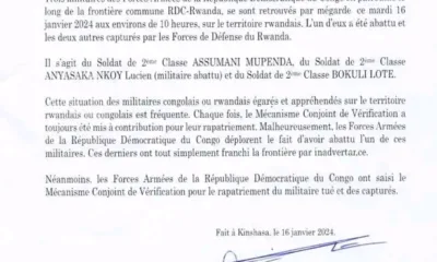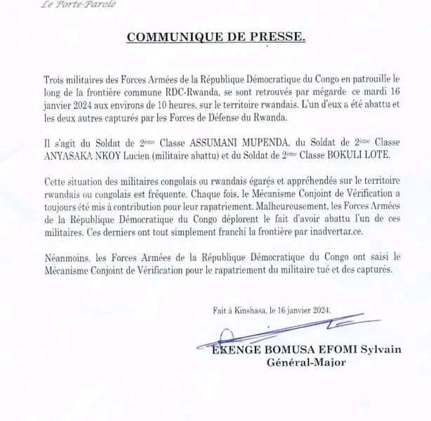 L’armée rwandaise a annoncé mardi avoir tué un « soldat » congolais et arrêté deux autres qui ont selon elle franchi la frontière entre les deux pays, dont...