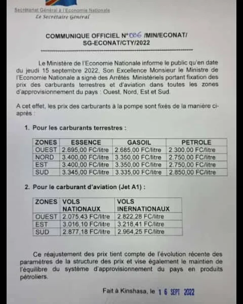 Le secrétaire général à l’économie, Célestin Twite Yamwembo , annonce que le ministre a.ï de l’économie nationale a réajusté les prix des carburants terrestres et d’aviation...