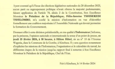 A travers un communiqué officiel émanant du Directeur de cabinet du Chef de l’Etat après la démission du premier ministre Sama Lukonde ce mardi 20 février...