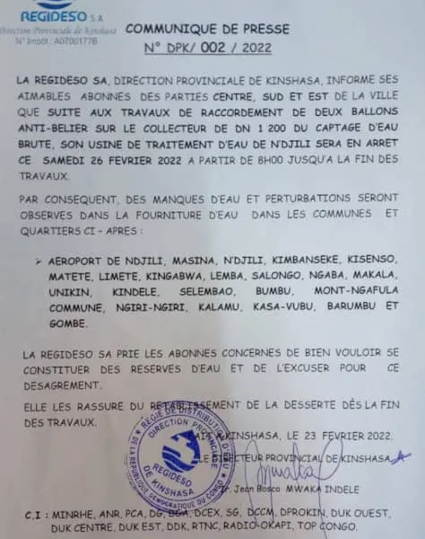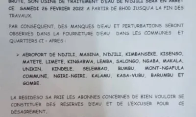 L’eau potable ne coulera pas ce samedi 26 février 2022 dans plusieurs robinets de la capitale congolaise. C’est la Régie de Distribution d’Eau (REGIDESO SA) qui...